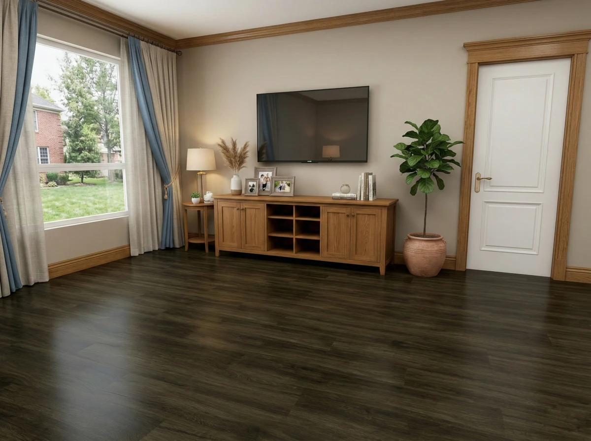 Add dramatic elegance and sophisticated depth to your home with our Smoky Midnight Oak Vinyl Plank Flooring. This stunning luxury vinyl flooring features a deep, charcoal-infused base with striking lighter grey and dark brown grain patterns that mimic the natural beauty of aged, deeply stained oak (see image 0 for detailed texture). Inspired by the dark night sky and wisps of smoke, its cool, rich tones provide a grounded foundation that contrasts beautifully with light trim, white cabinetry, and textile accents (as shown in the living room installation, image 1), creating a contemporary, high-end feel in any room.